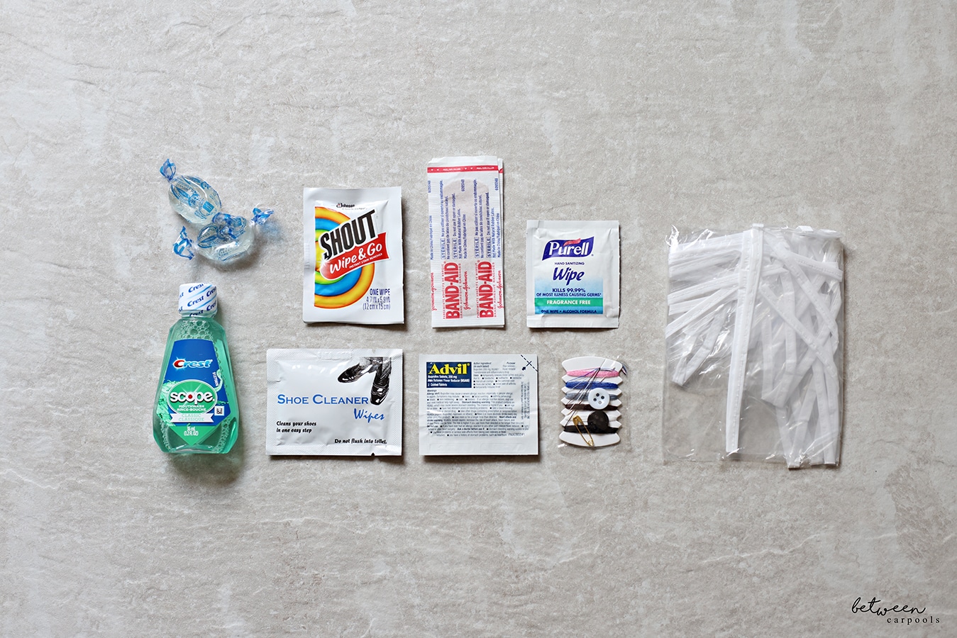 Some basics I like to put in include: Scope, Advil, Band Aids, a mini sewing kit with safety pins and a rain bonnet if there is rain in the forecast.