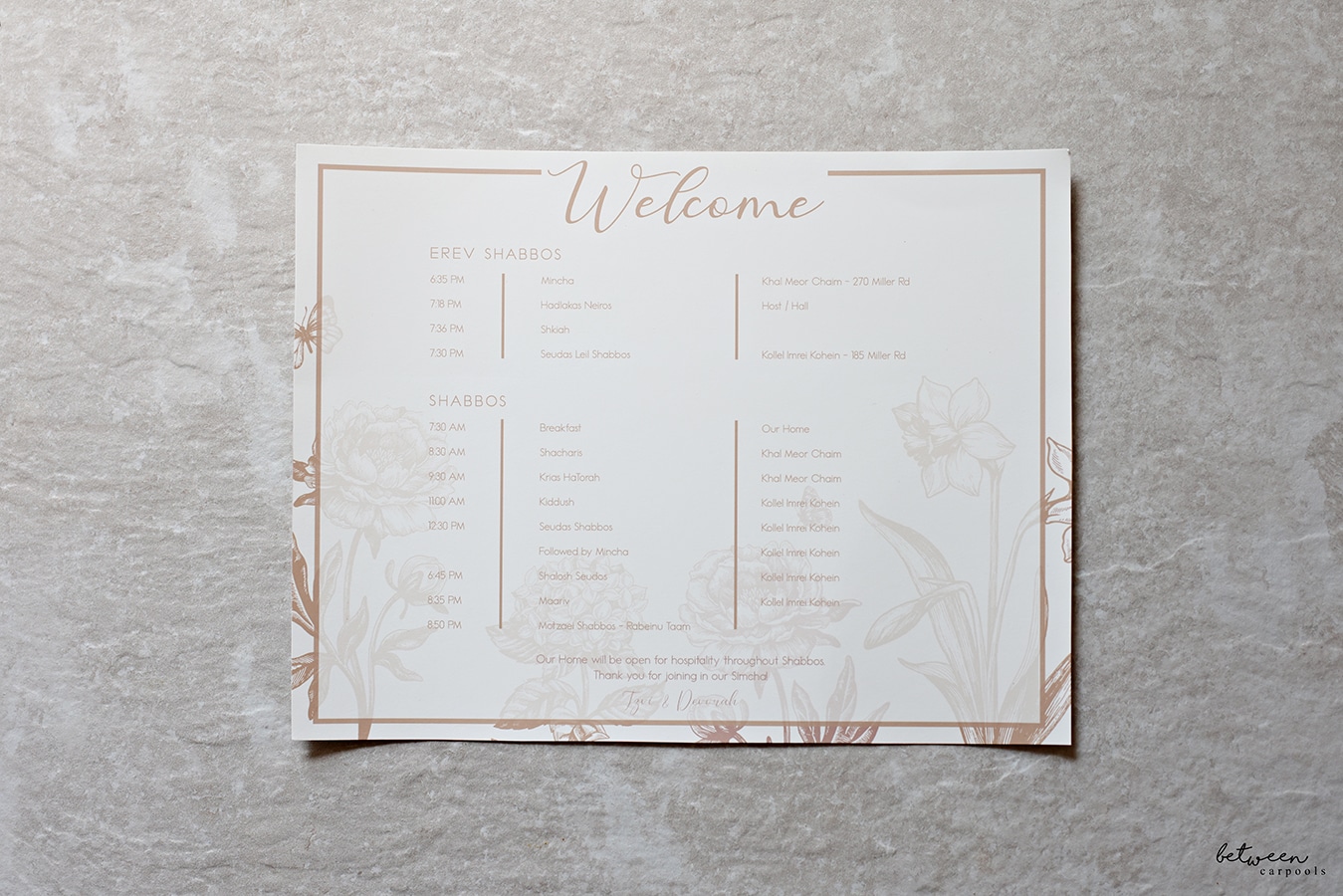 The itinerary is an important part of a well planned Simcha. Be sure to include time – location – address for each of the important events taking place over Shabbos.