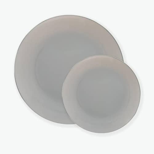 Of course, we’re setting the table using Luxe Party dinnerware. Let’s start with the table setting. We kept these neutral with white round coupe dinner plates paired with grey appetizer plates. The black/gold two tone flatware ties together with the black stemware (these are from Noir; any neutral glass will work!).