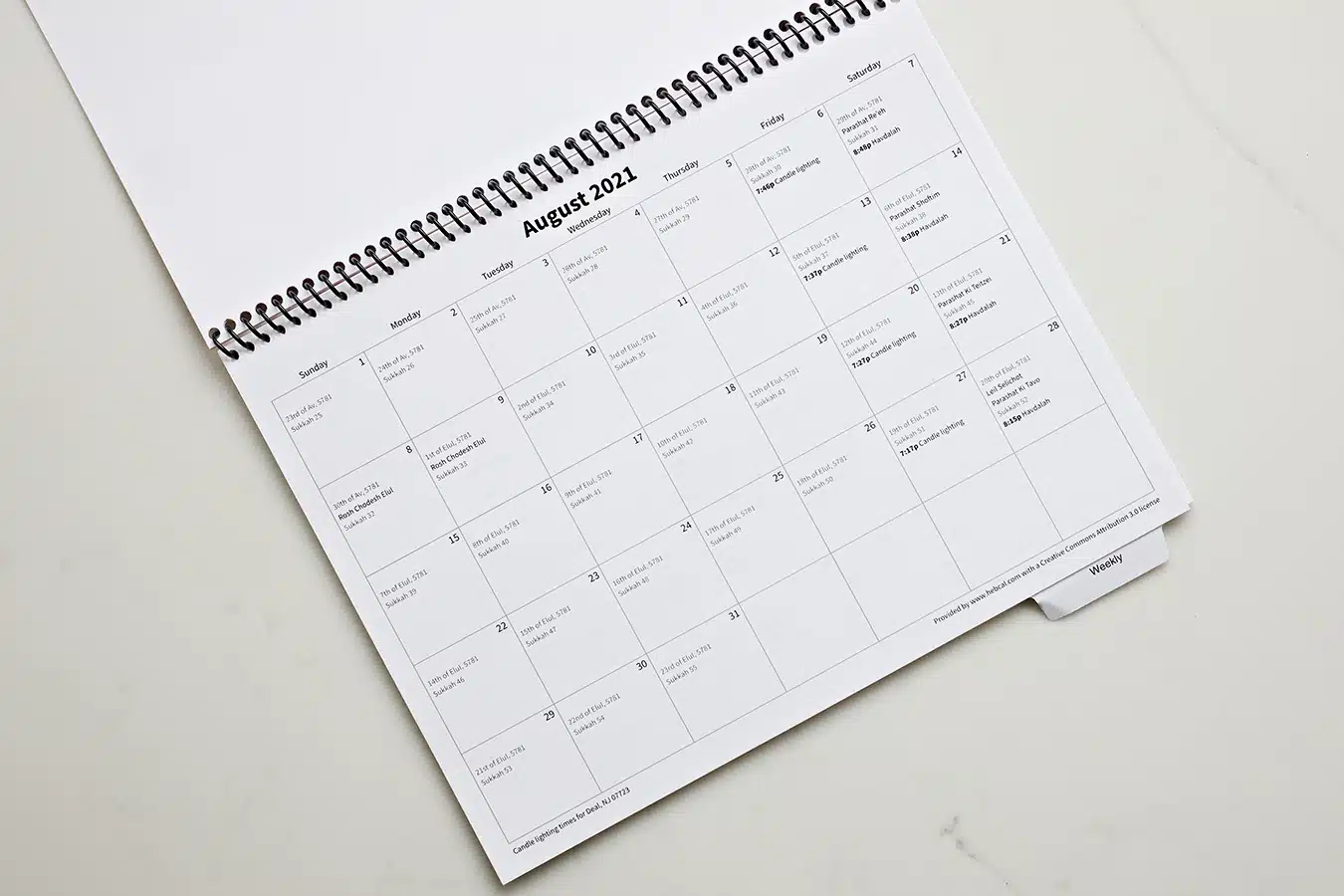Simply use a comb or coil binding to bind together a Hebcal calendar together with however many copies of Life Pages that you want. Add a piece of cardstock in the front and back. It’s also nice to include a tab between the monthly and weekly sections so it’s easy to flip from one section to the next.