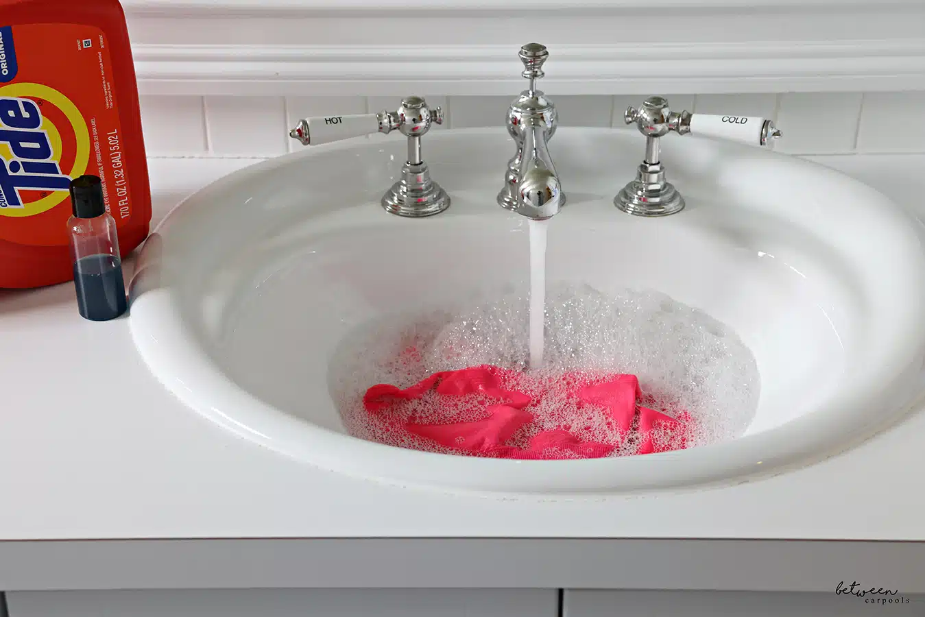 Start by filling the sink with water. For delicates, keep the water cold but for sweatier and dirtier items, use warm water. Add that drop of detergent while the water is filling and then place the item into the water. Let it sit for 15-30 minutes.