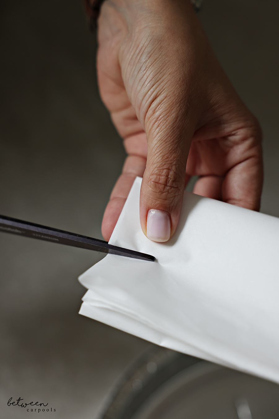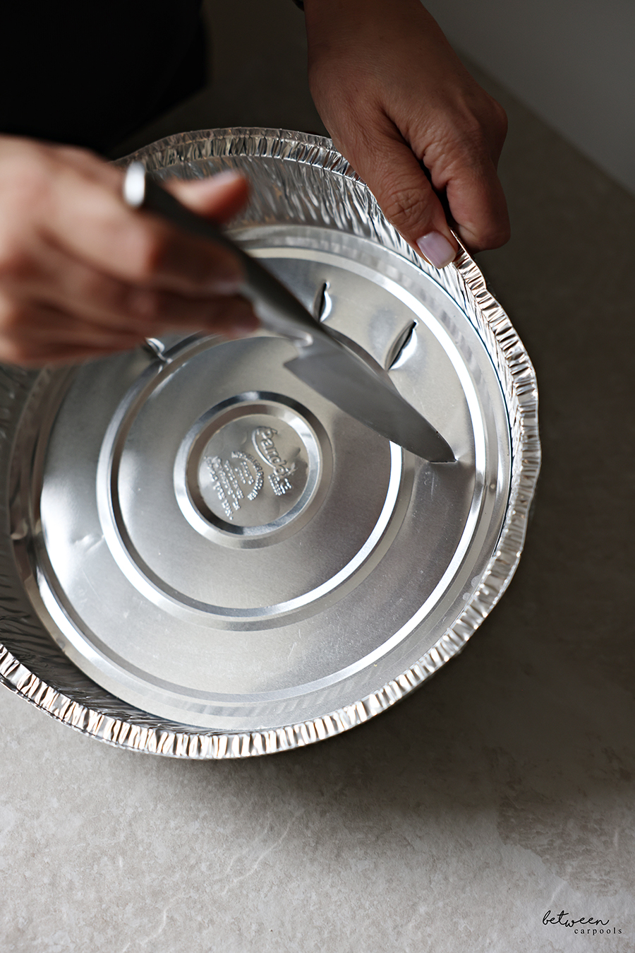 - Make 12 slits in the bottom of your disposable pan. Make additional slits in a piece of parchment paper that you line it with (this is easiest to do if you fold the piece of parchment paper in half twice, then use a scissor to cut a few slits).