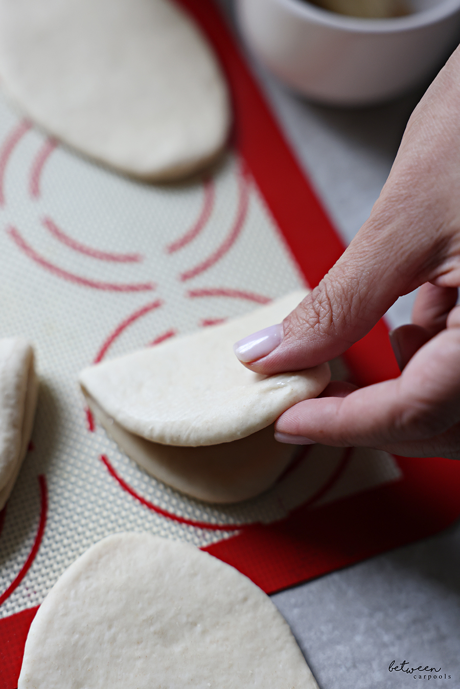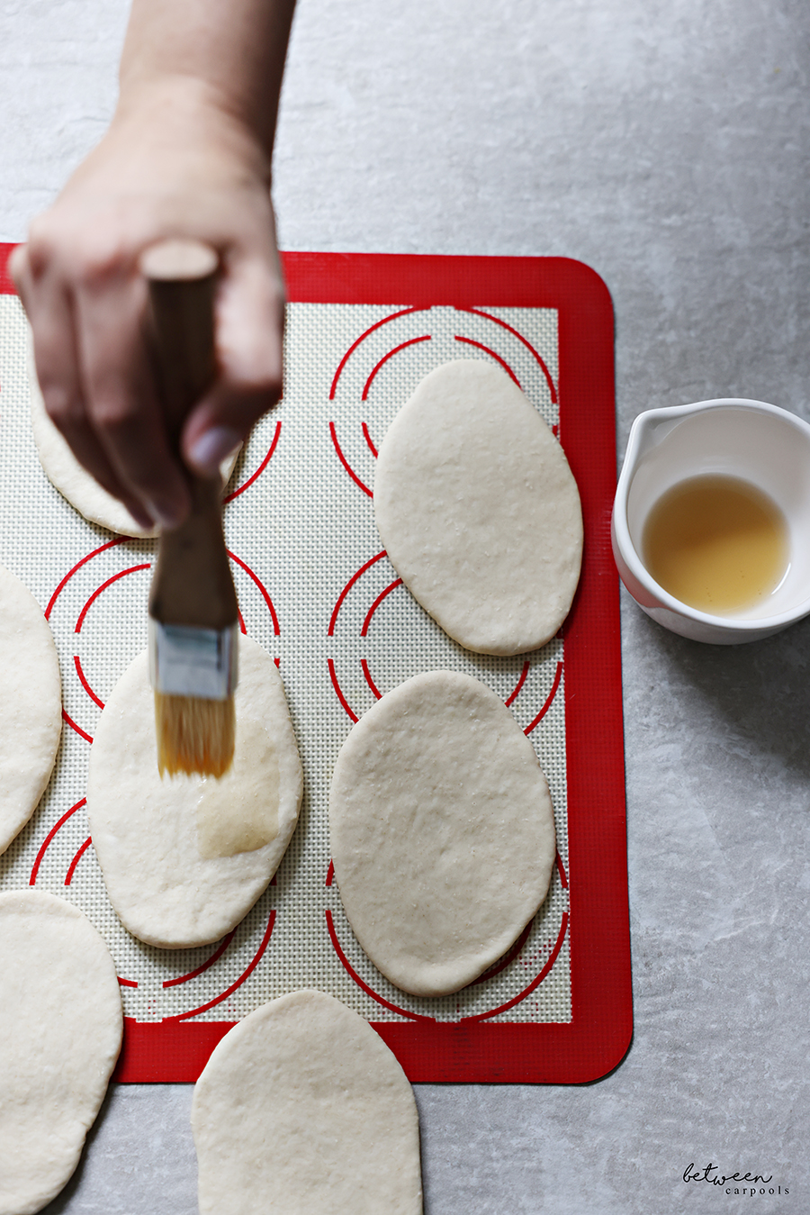 - Shape the dough into a log. Let rest 20 minutes. Cut into 12 evenly sized pieces and roll into balls. Then, flatten each ball into an oval shape (you can use a rolling pin). Brush the top side of each oval with sesame oil, and fold them in half.