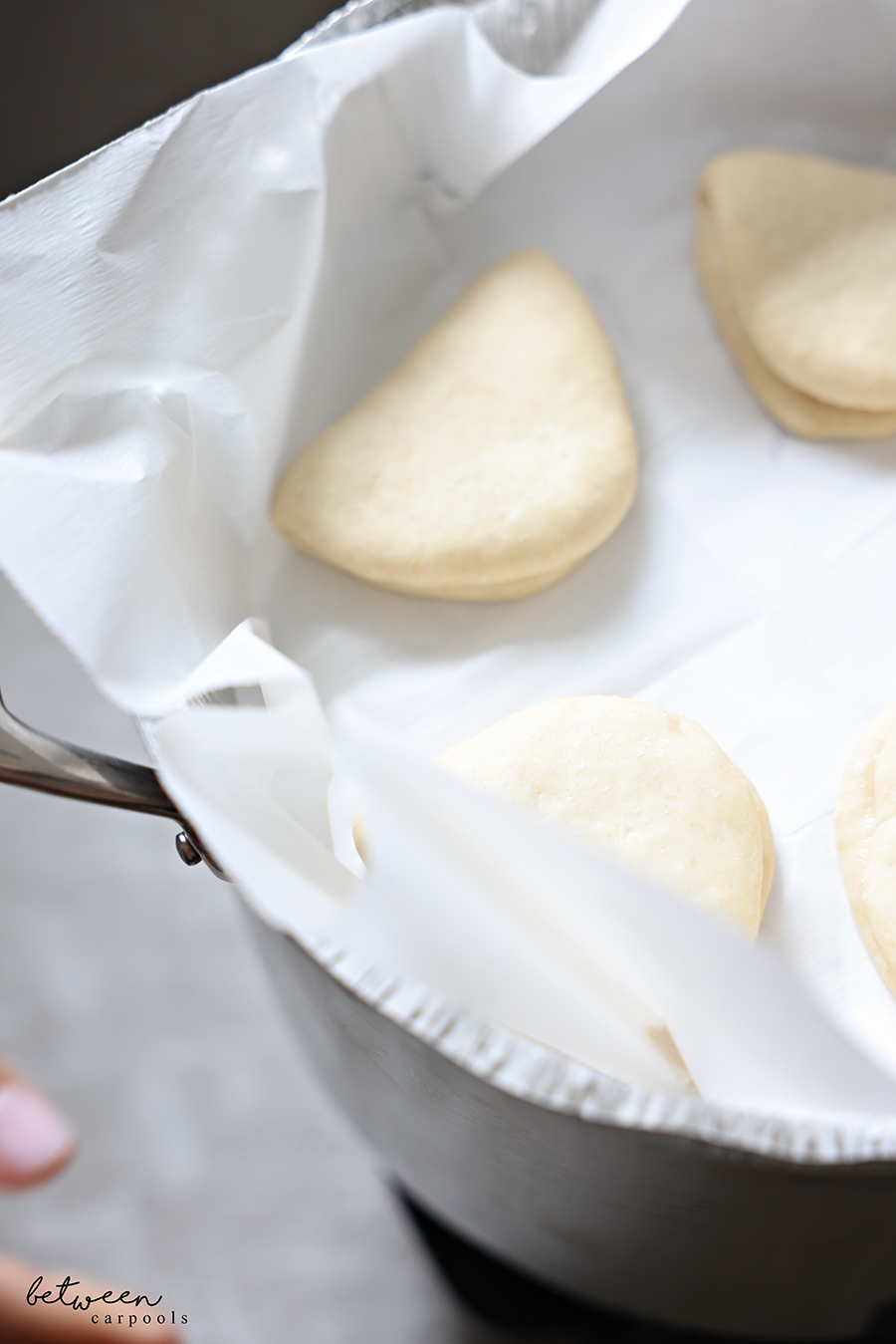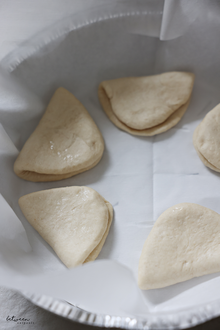 Fold the ovals in half. Once all the buns are shaped, cover and let rise for 30 minutes, until they puff up a bit.