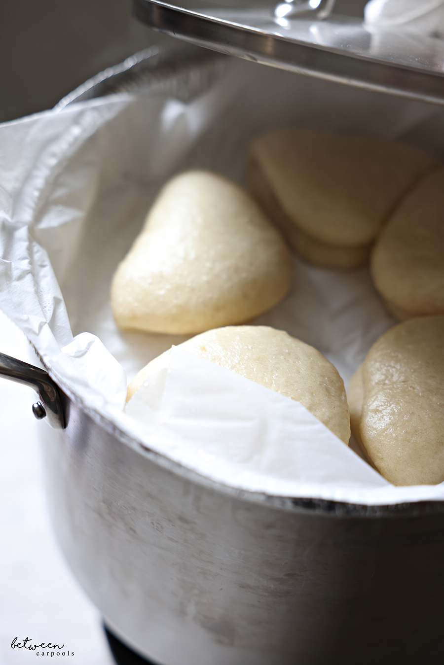 Bring a pot of water to a boil and add the pan/steamer and the parchment-lining. Add buns to the pan (about 5 at a time).
