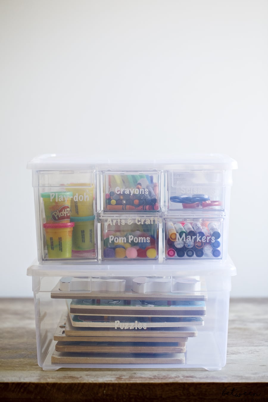 - The Sweater Bin- this is a really practical solution! It’s a great size for board puzzles (this one is my favorite). I love how, when I want my kids to be busy with puzzles, I can grab the whole container, and let them get “lost” in puzzle land. The clean up is easy because you don’t have to “match up” each puzzle piece to its puzzle. You can just place it in the container and leave it as a challenge to match up all the pieces to the boards for the next time you take out puzzles.