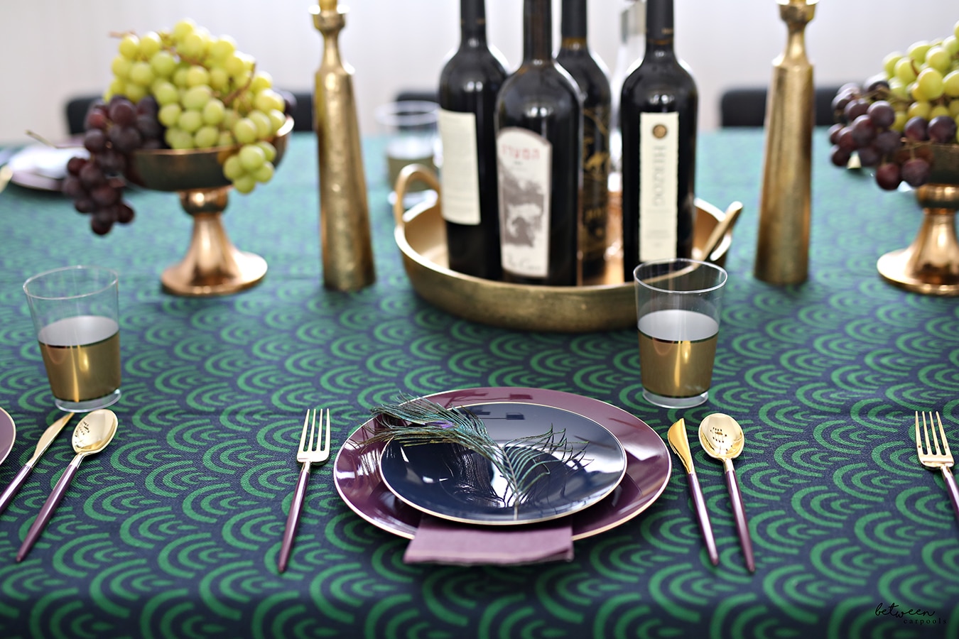 Our centerpiece is wine because, well, that needs to be on the table anyway. The gold bowls, tray, and candlesticks were items that we had in the house.