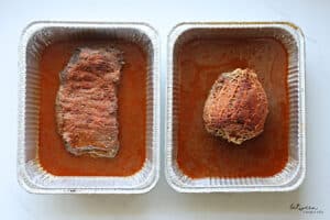Using the recipe for Victoria’s maple bourbon ribs, I prepared both roasts at the same time. I used the same spice rub and added the broth halfway up each of the meats. After about 3 hours in the oven at 325⁰F, the brisket was ready for shredding. The chuck roast was still too tough, but about 2 more hours in the oven and the chuck roast was soft and shredded easily.