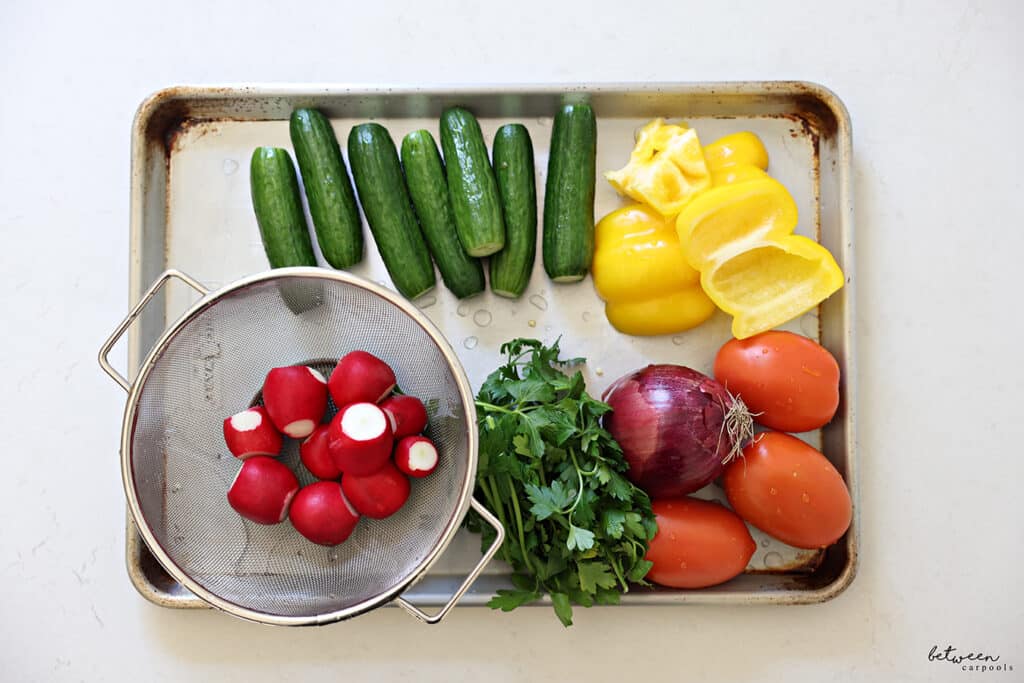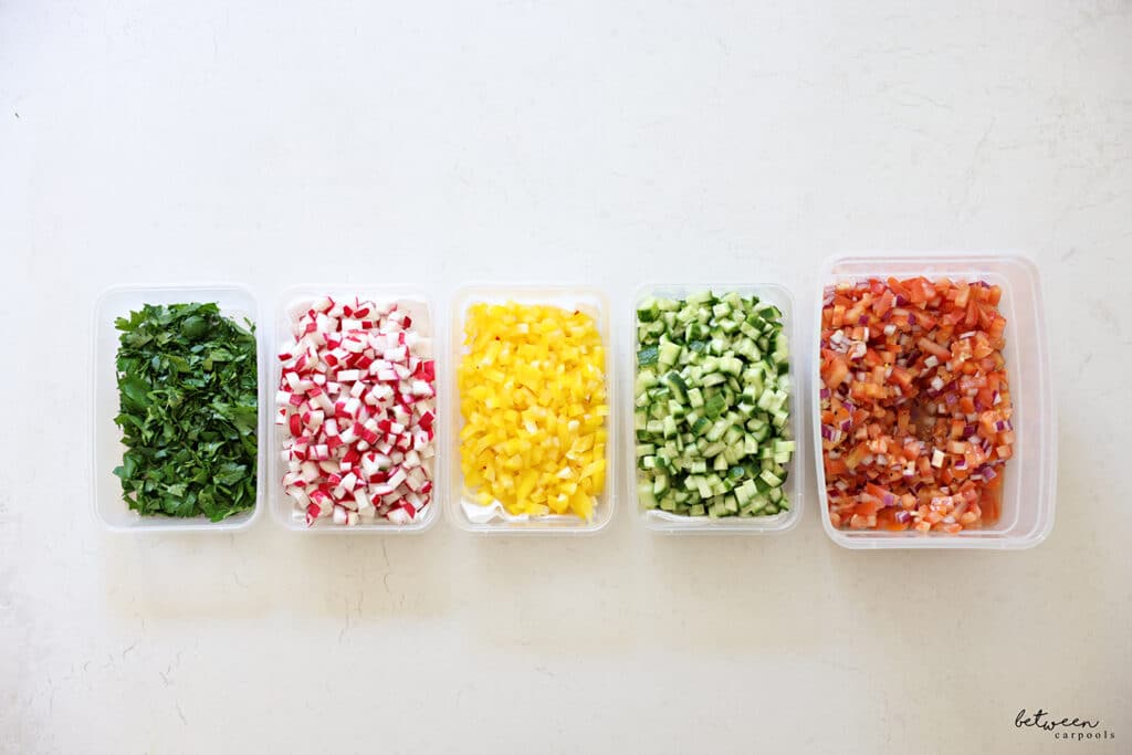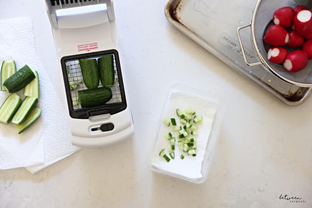 - Start chopping your veggies: Use small resealable containers. Line the bottom with a folded piece of paper towel. Do this for the cucumber, the pepper (if using a few colors, you can put those together), and the radishes.