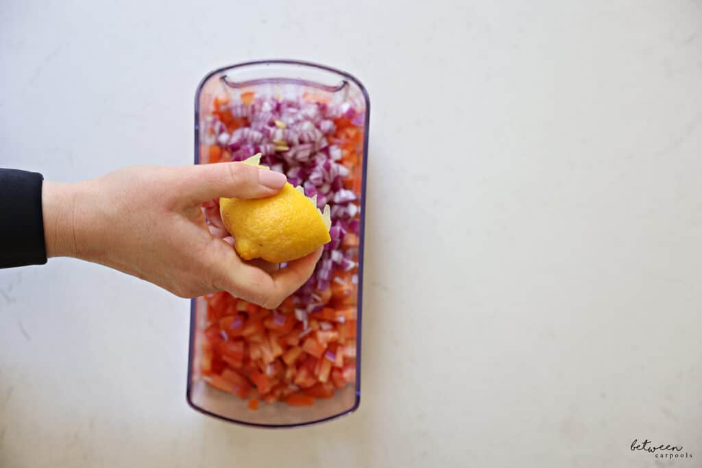 - In another container, combine the chopped tomatoes with the onion. Then, add the dressing: the lemon juice, olive oil, minced garlic, salt and pepper. Mix and taste, make sure it's a bit saltier than you like it, remember that you are adding many vegetables to this.
