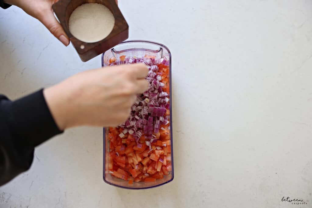 The first thing I want to tell you is that, like in our famous mango salsa (famous because it made it into Dinner Done, that’s how good it is!) the dice is really important. It literally plays a role in the taste of the salad. Small and even is the way to go. Consistency is key.