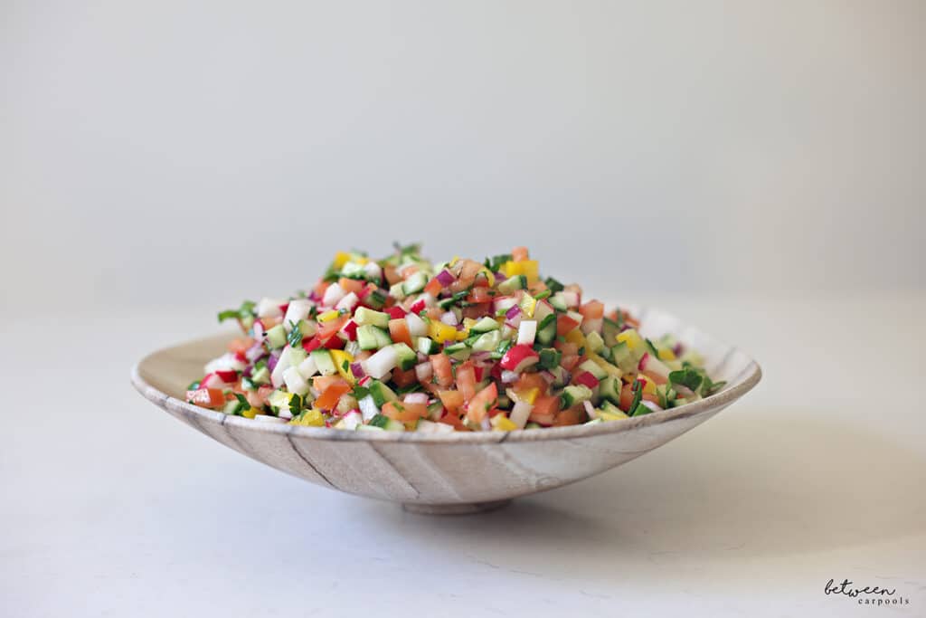This Israeli salad recipe seems simple and flexible, allowing for personal preferences and adjustments. The tip for keeping the vegetables fresh by dividing them into separate containers with paper towels is helpful for prepping in advance. The use of a vegetable chopper can also make the prep process easier. Overall, this recipe looks delicious and worth trying.