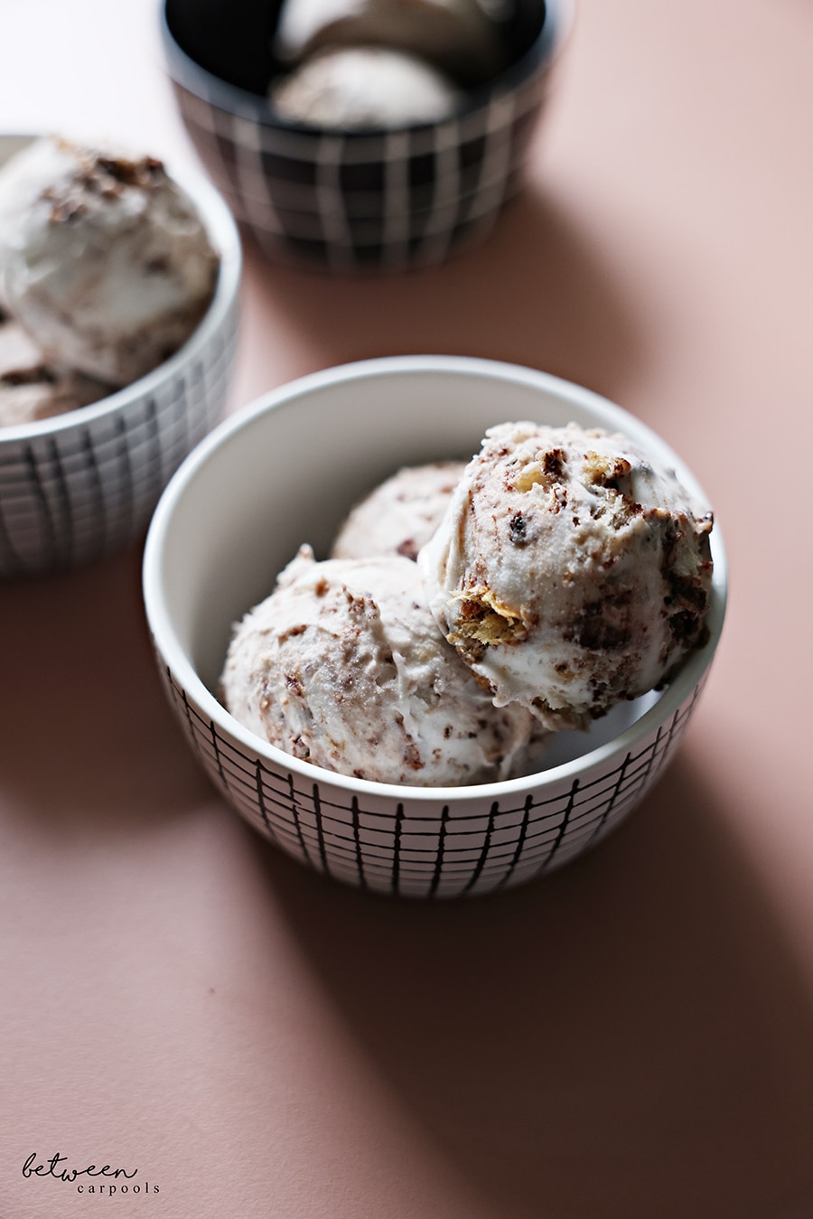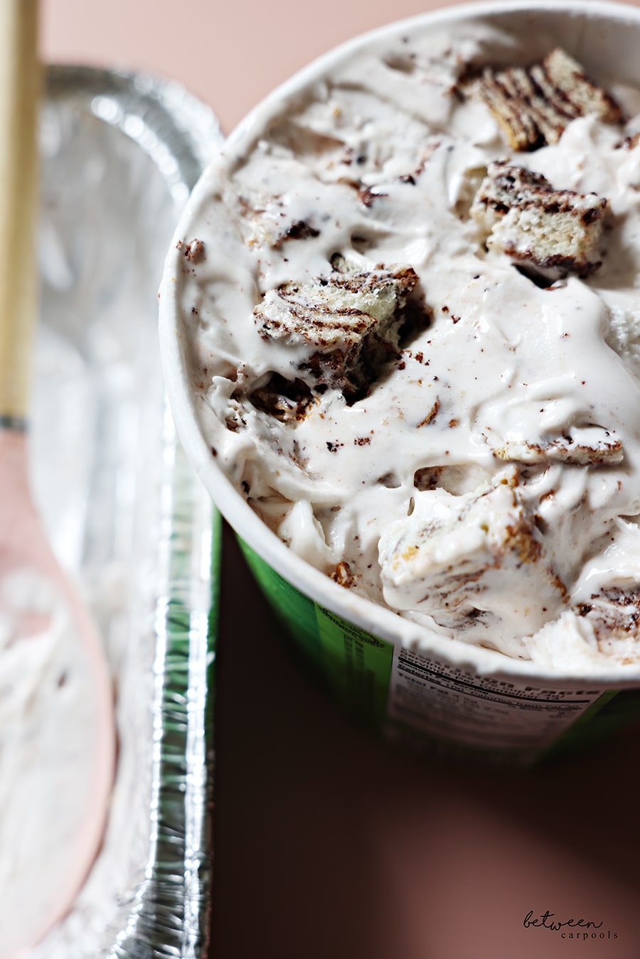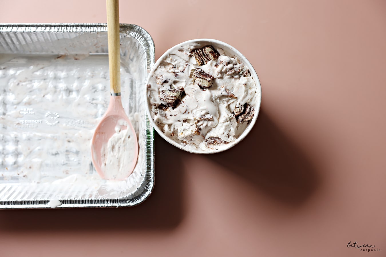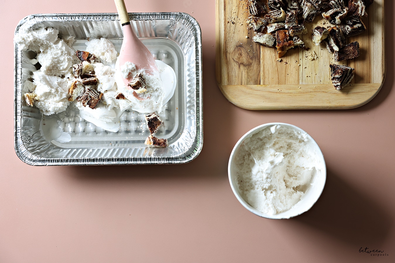 Cut the babka into croutons-sized pieces. If it’s already dried out, there is no need to toast it. But if your babka is fresh, toast the croutons by placing on a baking sheet and bake at 375℉ for 7-8 minutes. Mix babka croutons into a carton of semi-defrosted vanilla ice cream.