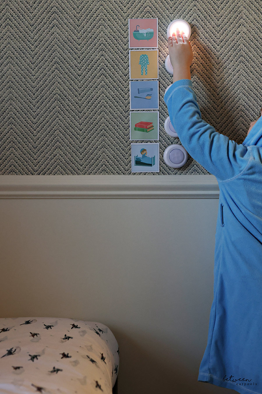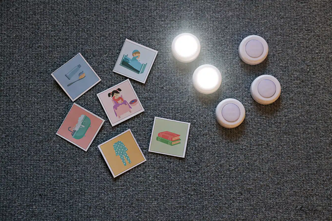While it’s more fun to turn on the light, an alternative way to do it is to turn on all the lights, and tap them closed as each one is accomplished. When the lights are all closed, it’s time to go to bed!