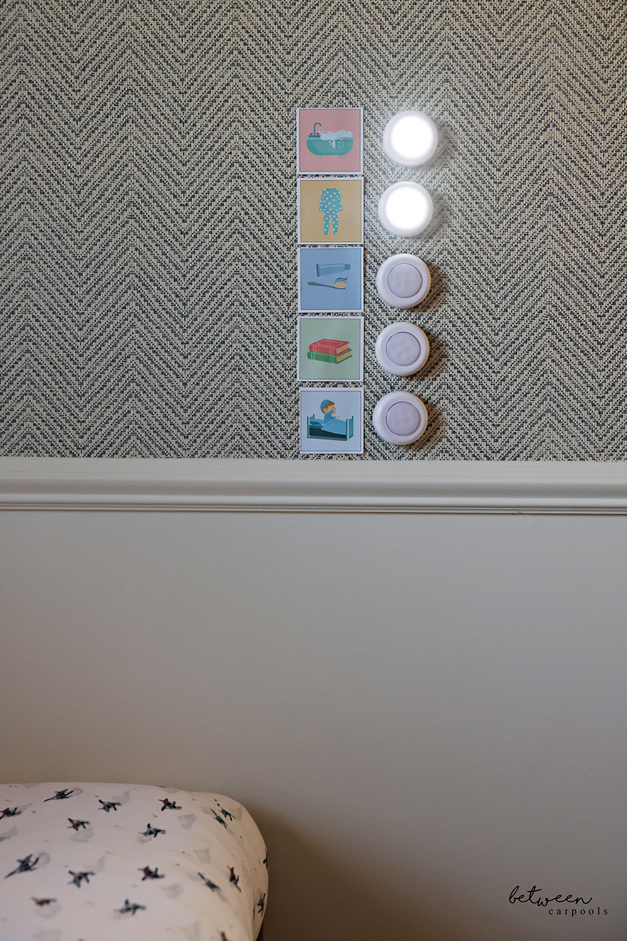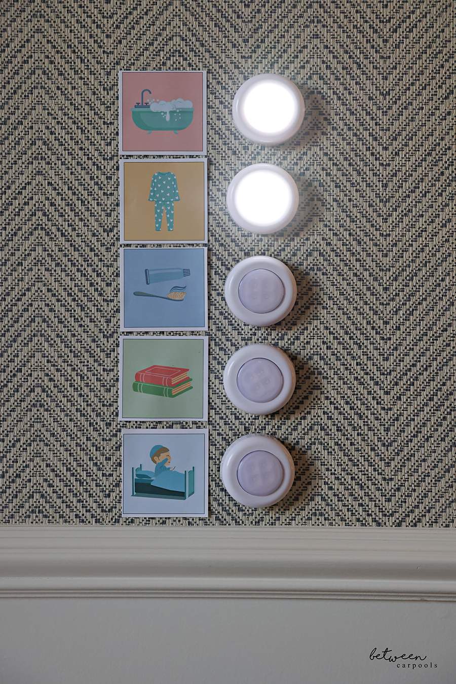 Use painter’s tape to affix the pictures or photos to the wall. Then, place the Tap Lights next to them. (Note that you will need Triple A batteries.) The Tap Lights include adhesive on the back so they’re easy to stick on and easy to remove.