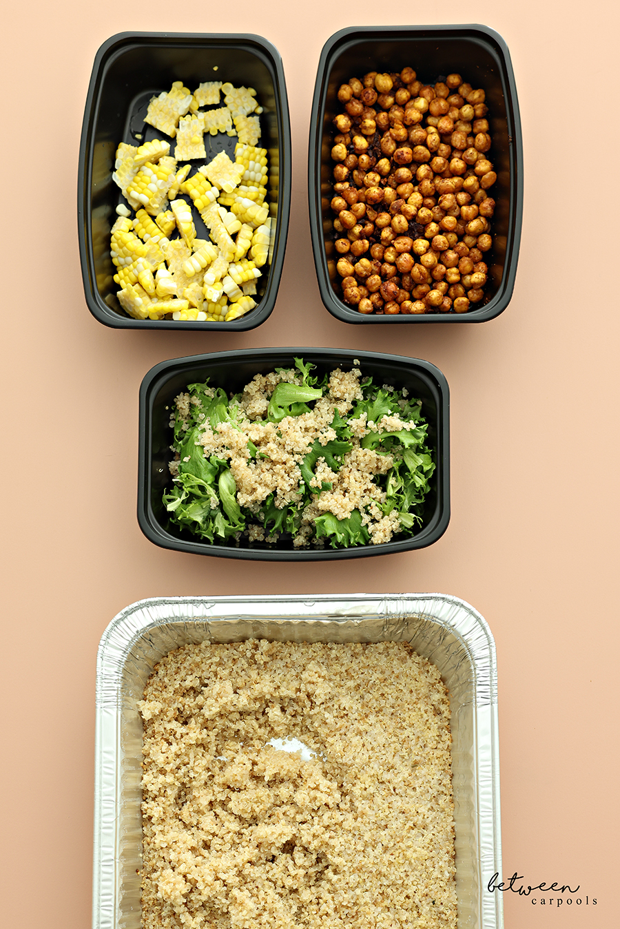 Some more great components to have on hand besides for cooked grain is roasted chickpeas (very filling addition) and cooked corn.