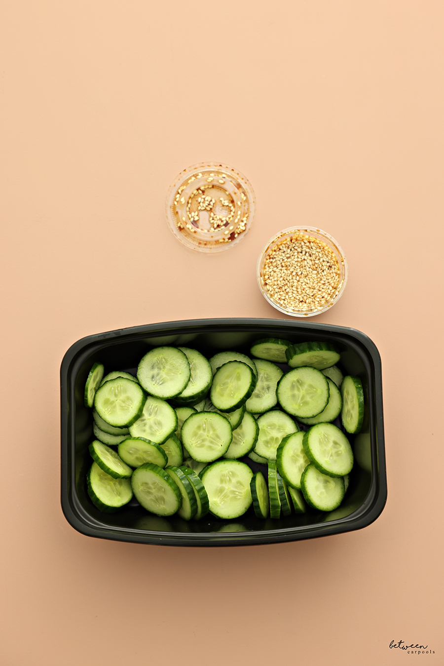 Salads don’t need to be boring! Store dressings separately and enjoy fresh, crunch options like this (the dressing is a mixture of soy sauce, sesame oil, and sesame seeds).