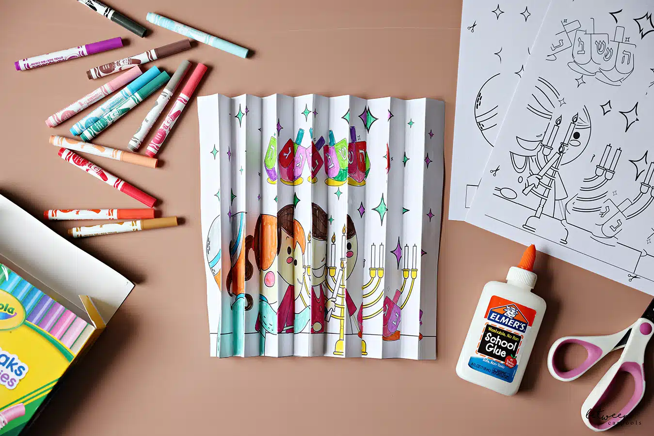 It’s called an agamograph and your children will love coloring and folding this accordion-style Chanukah coloring page to make their own version!