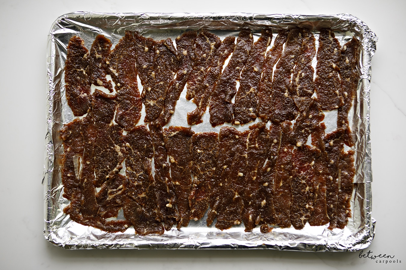 - Line a baking sheet very well with foil. Spray the pan very well. Lay the pieces of meat flat on the baking sheets (each pan will fit one pound). The pieces of meat can touch but they should not overlap.
