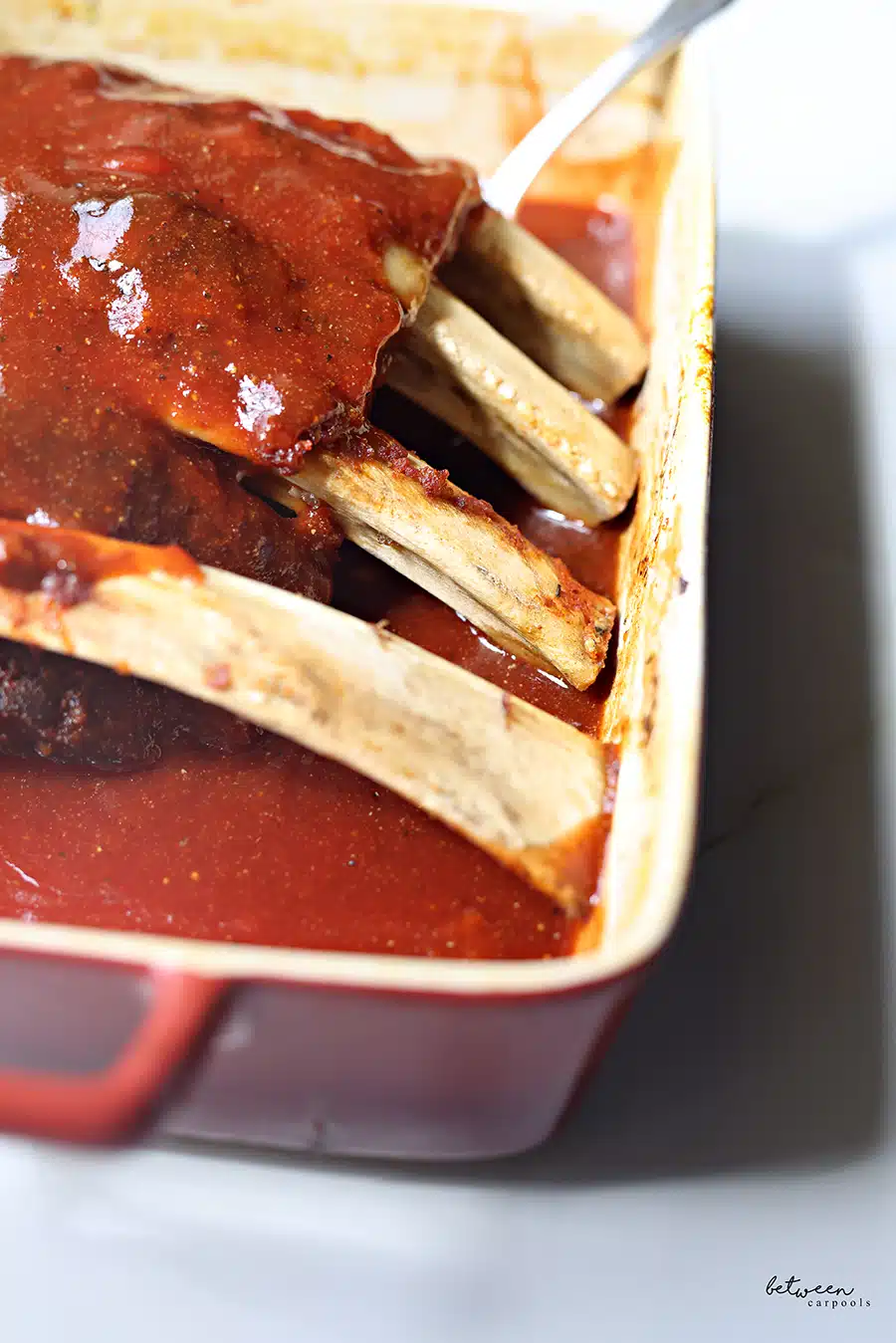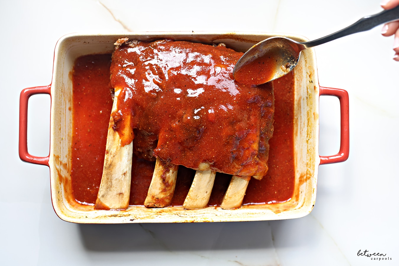 - Add ribs to a Dutch oven, roasting pan, or baking pan. Add beef stock most of the way up the sides of the ribs. Cover tightly and bake for 3 hours.