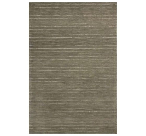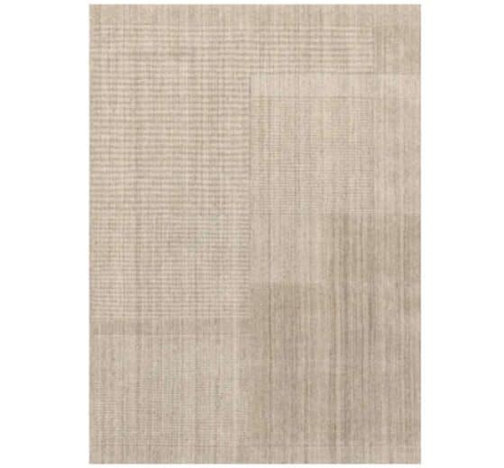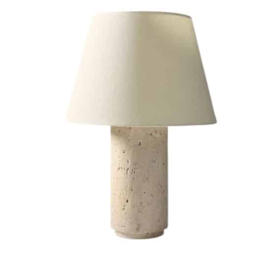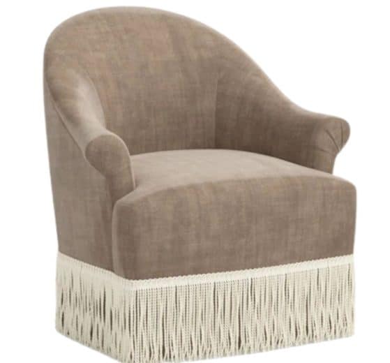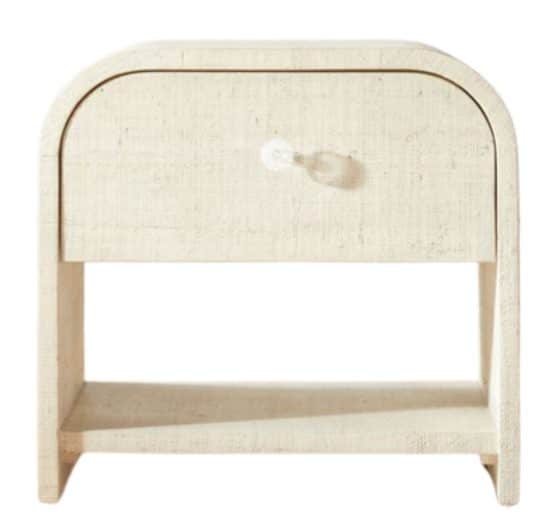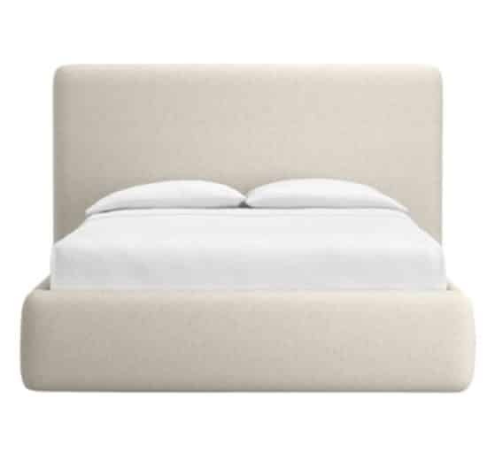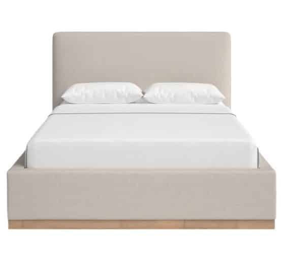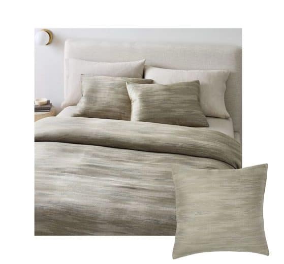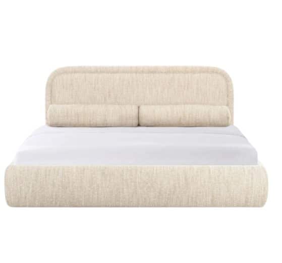 Crate Anneli Upholstered Bed | Olive/Ivory Area Rug | Walnut Bedside Table | Altan Accent Stool | Beige Chenille Barrel Chair | Linen Fringe Pillow Covers | Travertine Lamp | Striated Duvet Cover & Shams