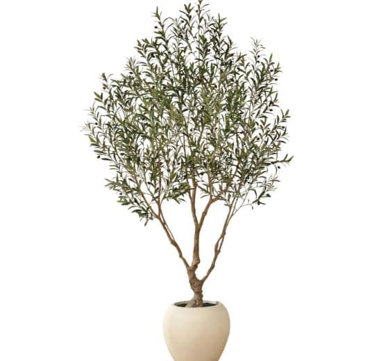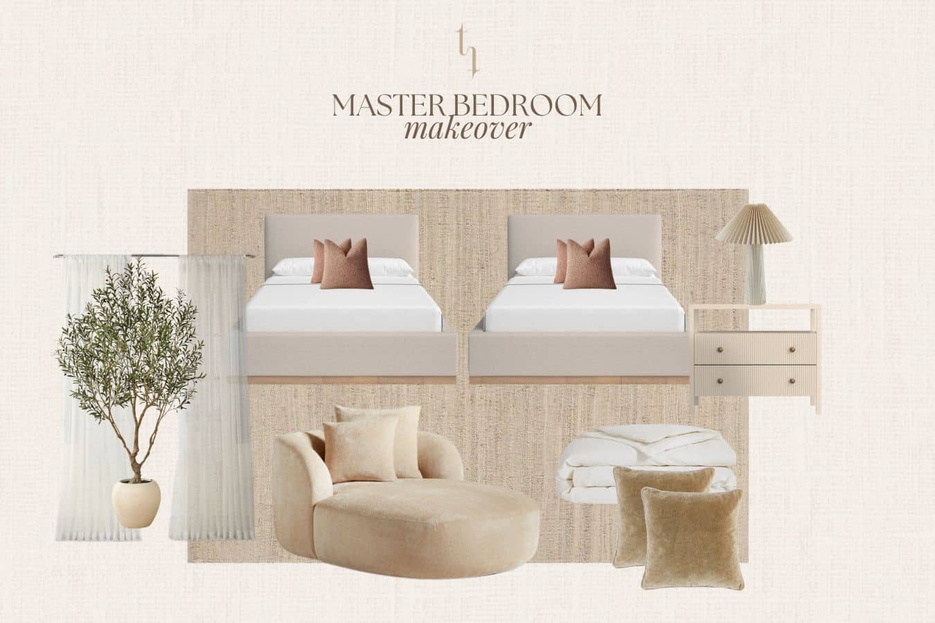 Delpha Upholstered Bed | Jute Blend Area Rug | Dusty Orange Throw Pillows | Jeanette Ribbed Nightstand | Table Lamp with Pleated Shade | Sogno Chaise Lounge | Velvet Pillow Cover | 8 ft Faux Olive Tree | Sheer Curtains | Buttery Soft Sateen Linens (these linens are a personal fav! They are so luxurious and buttery soft!)