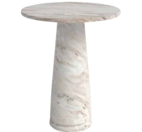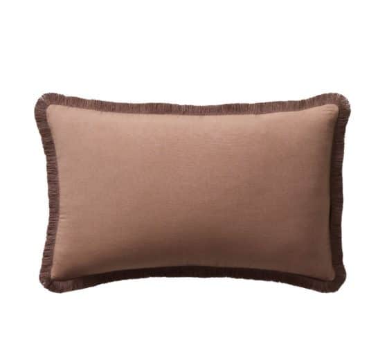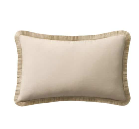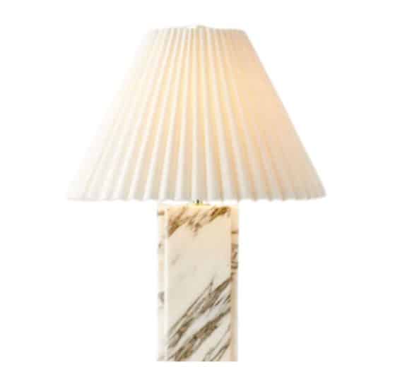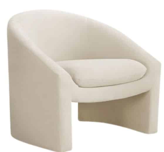 Muriel Boucle Bed | Bianca White Marble Table Lamp | White Lacquered Linen Nightstand | Buttery Soft Sateen Linens | Linen Fringe Pillow Covers | Beige Fringed Area Rug | Marie Fringed Armchair | Daktari End Table