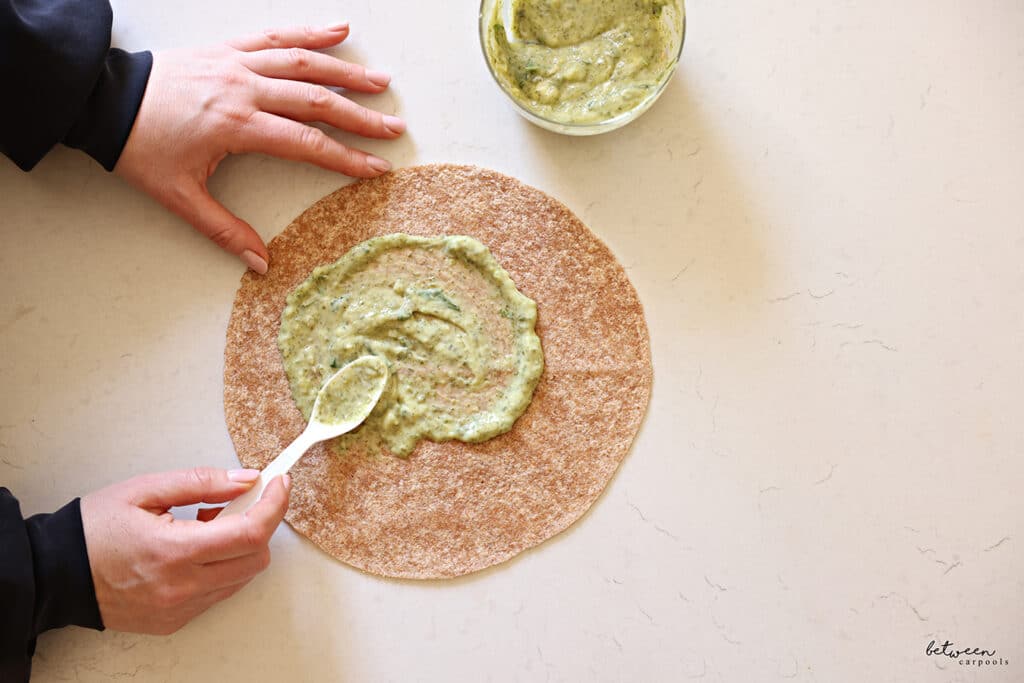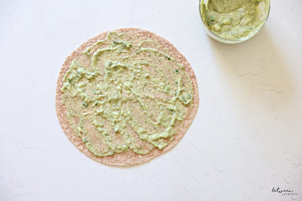 - Place the wrap on a piece of parchment paper. Spread pesto mayo thinly on the wrap.