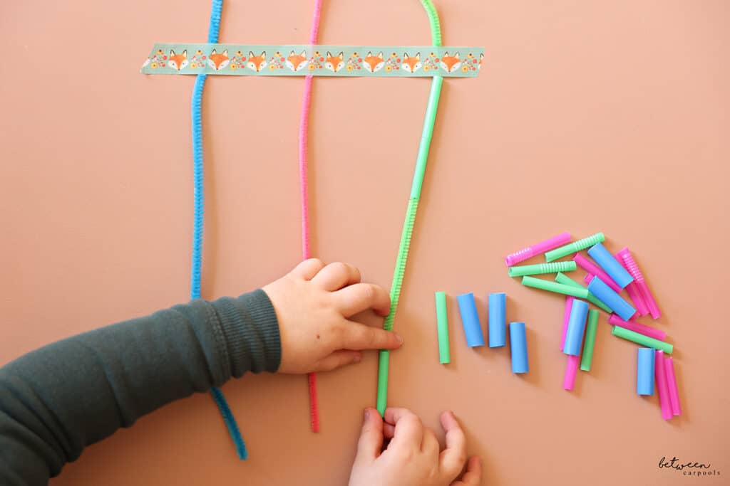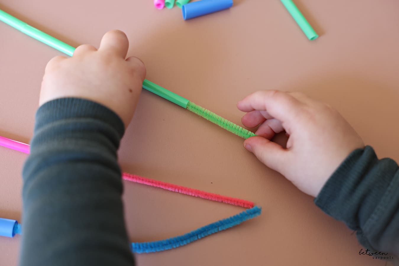 Let your child match up the color straw to the pipe cleaner and let them slide it in.