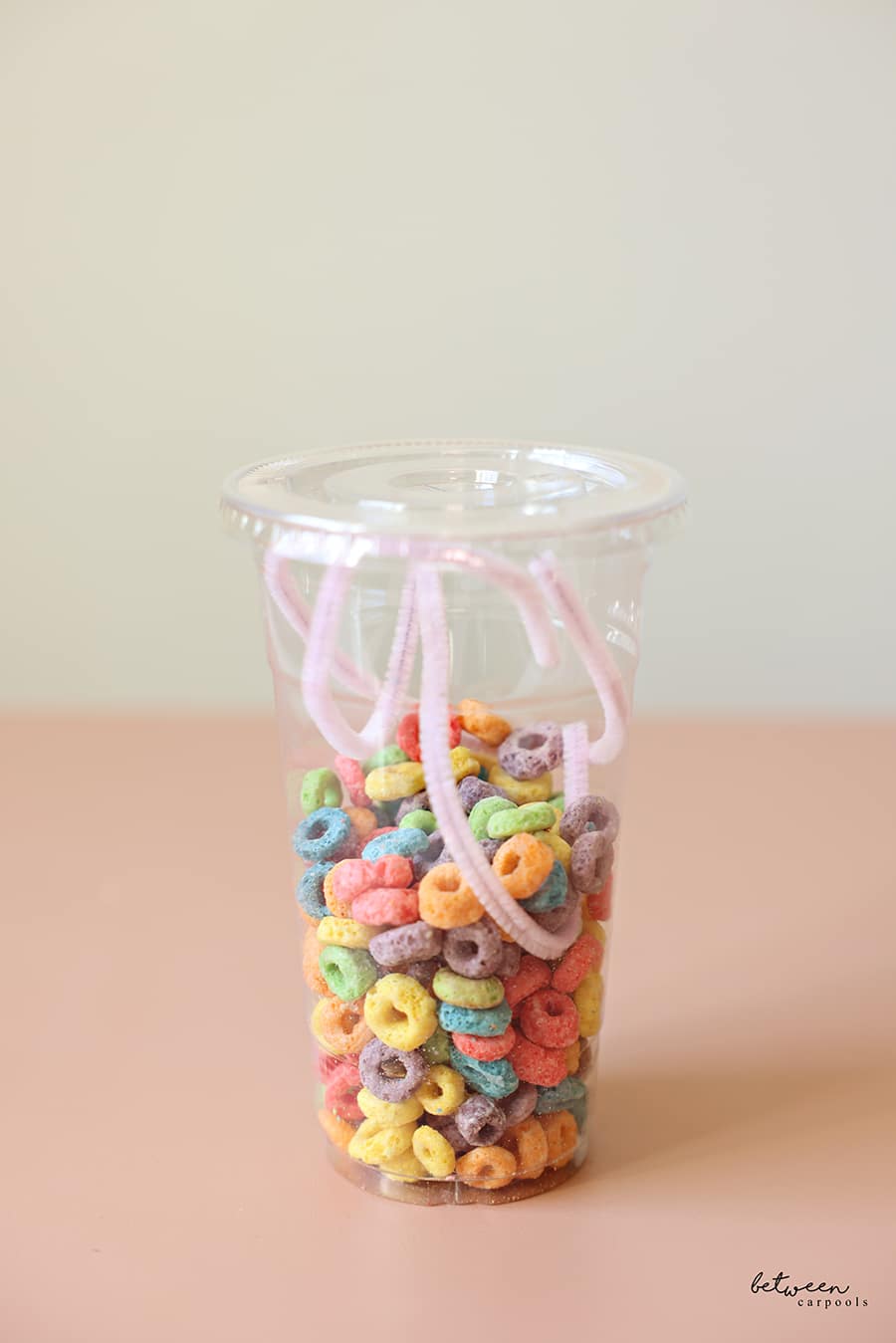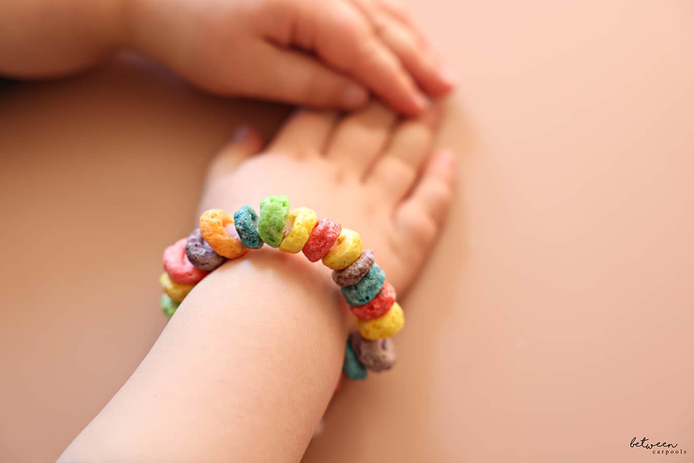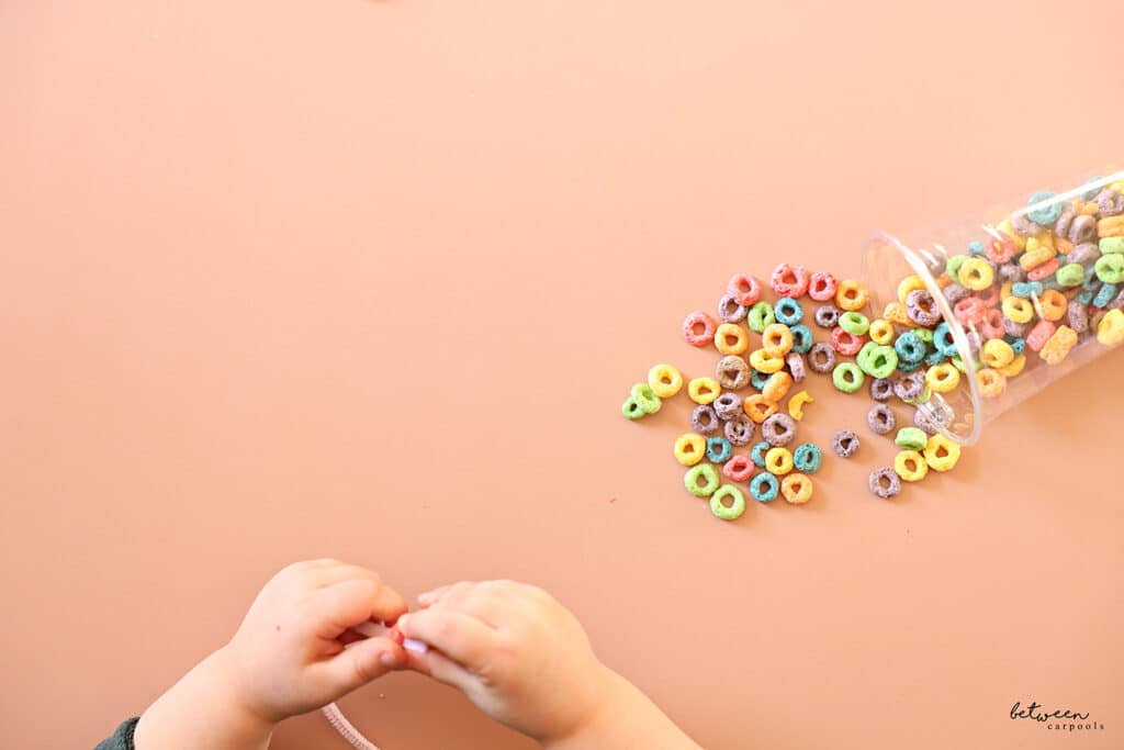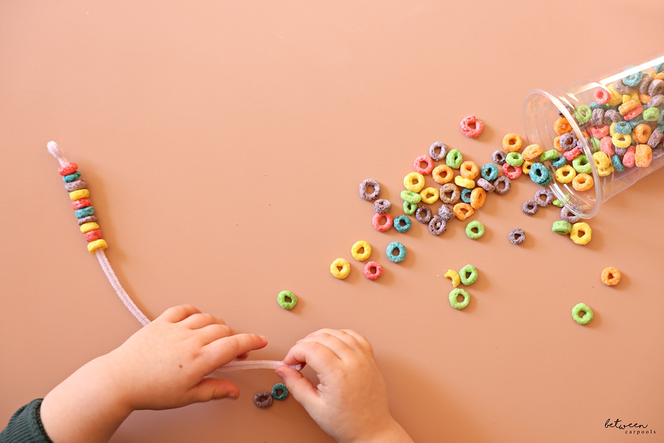 This is the best activity for so many ages! We also use this as a travel activity. I pack the Fruit Loops in a toddler snack cup which keeps it neat. It lets the kid have fun while in the car without making a mess. It’s fun and delicious too!