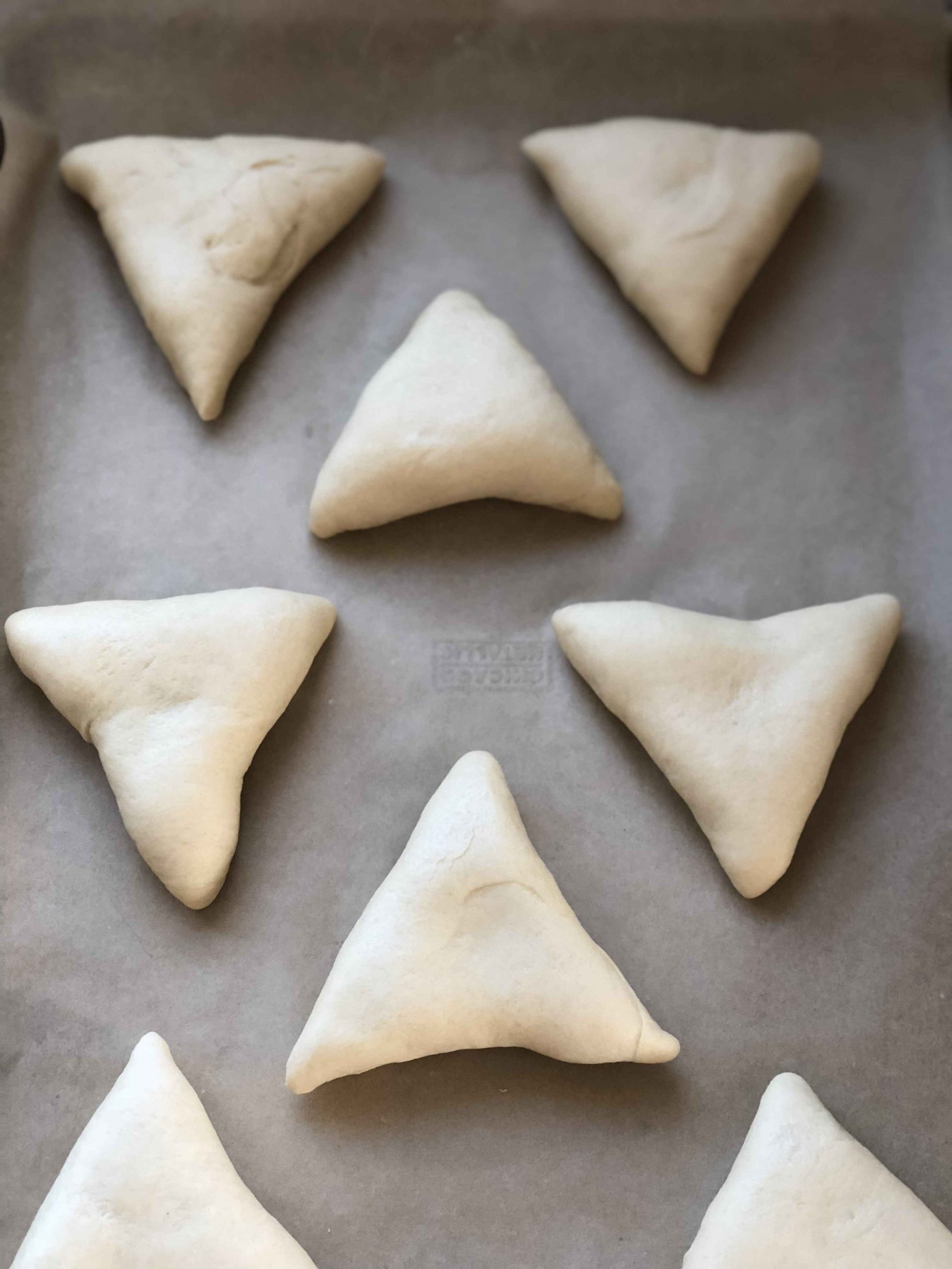 - Fold the dough up on 2 sides and pinch to form one corner. Fold up the third side and pinch additional 2 corners to form a triangle (just like you would a traditional hamantash). Continue pinching all 3 corners all the way up to the center to seal filling in completely. Once tightly sealed, carefully flip your dough over so the sealed side is face down. Feel free to manipulate dough as needed to form a neat triangle.