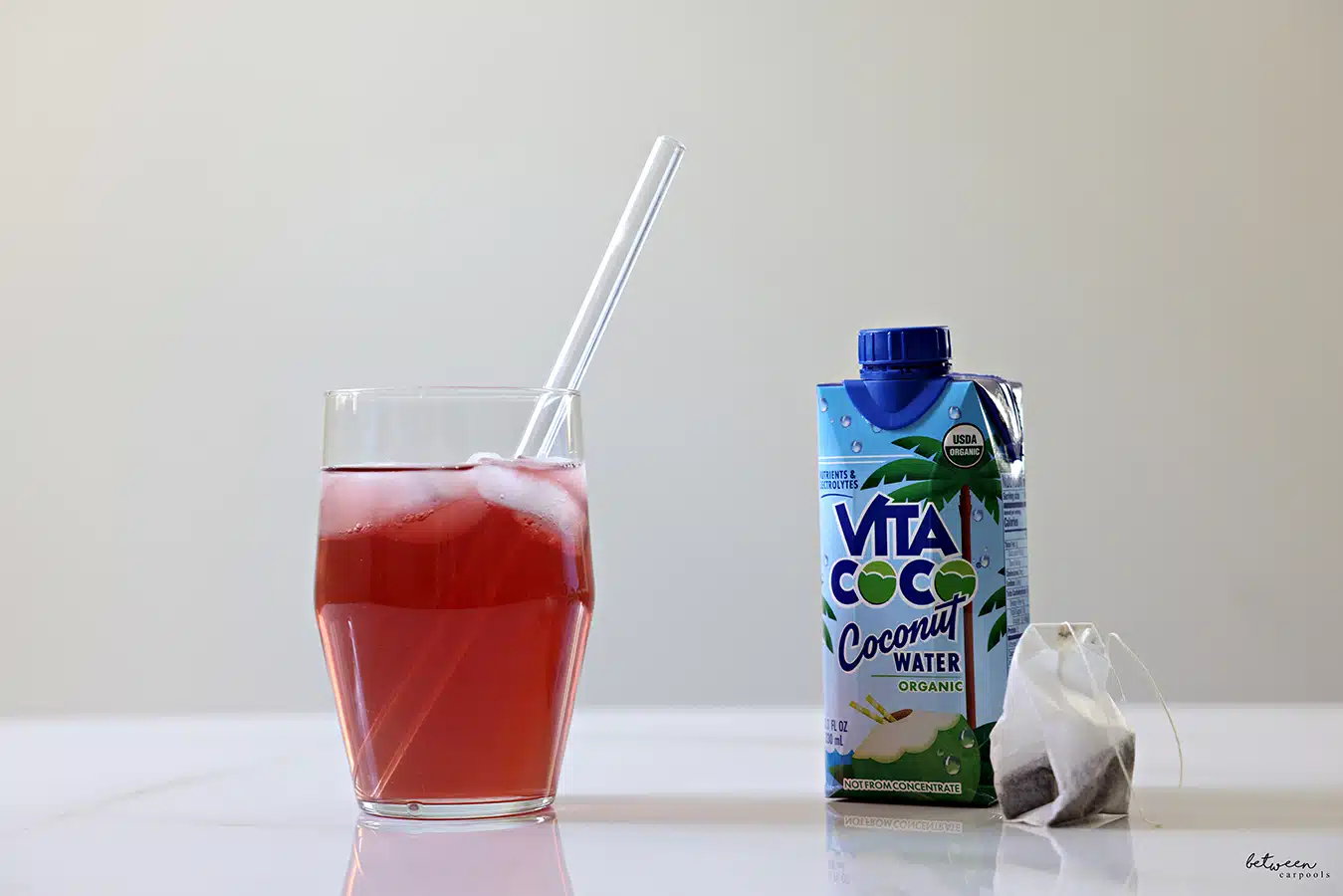 Once the tea has cooled, add it to your coconut water along with some ice!