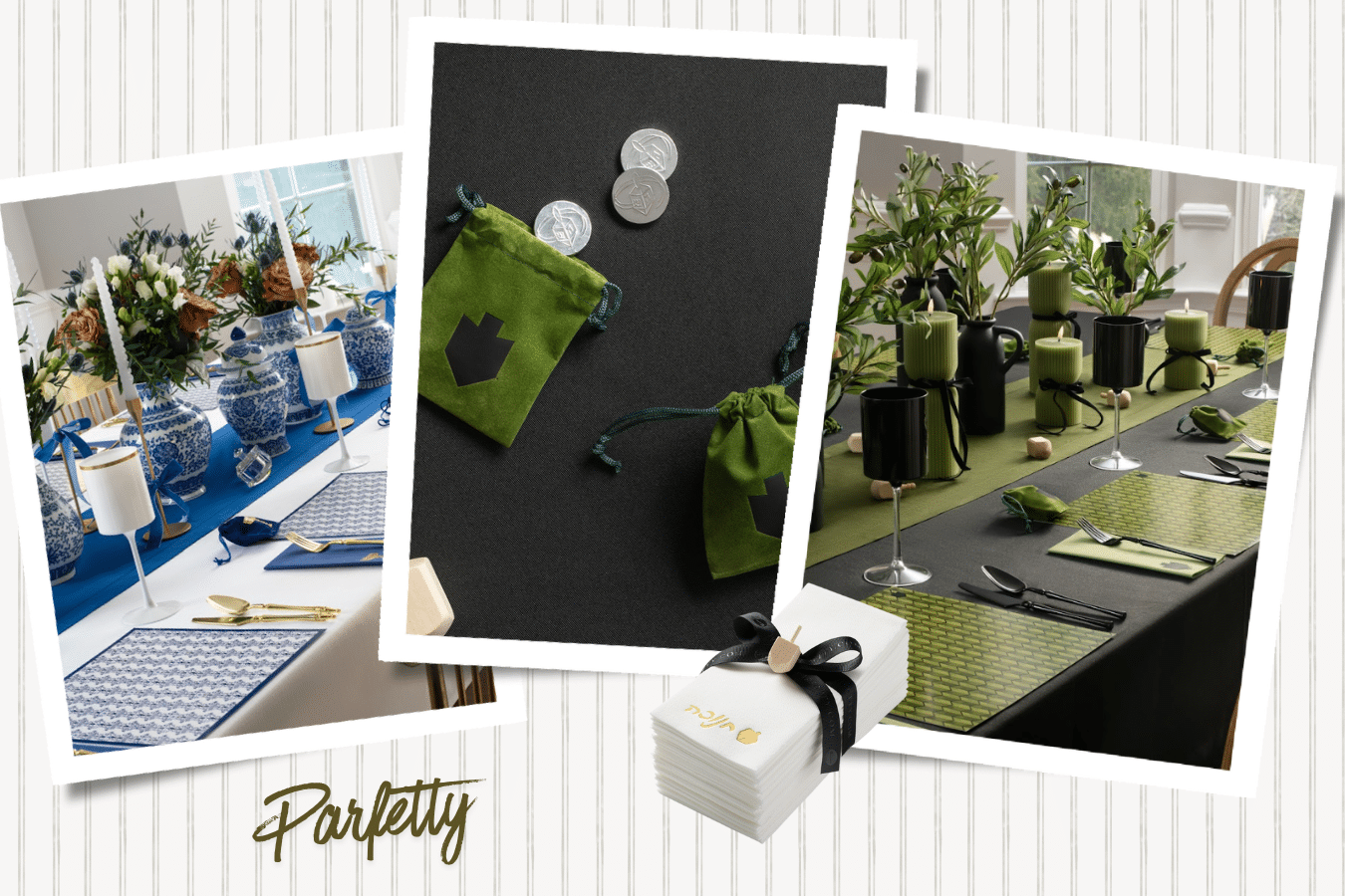 Parfetty provides all the links and resources to complete the setup of each party the way it’s pictured. Parfetty Parties are giftable too! Gift your host with the elements she needs to upgrade her party. Party gift packages come beautifully wrapped with Chanukah napkins. Browse Chanukah at Parfetty here!