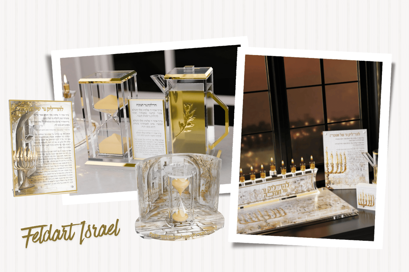 Explore Feldart Israel’s stunning range of modern lucite pieces crafted to illuminate their Chanukah this season. From sleek menorahs to beautifully designed oil jugs and bracha cards, each piece adds a refined glow to your home.