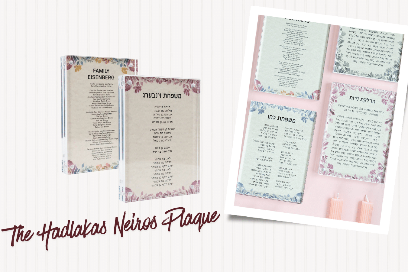 A double sided acrylic Hadlakas Neiros plaque, personalized with her children’s names fulfills everything you want in a gift. It’s a beautiful reminder of the power of davening for her family as she lights the Shabbos candles.
