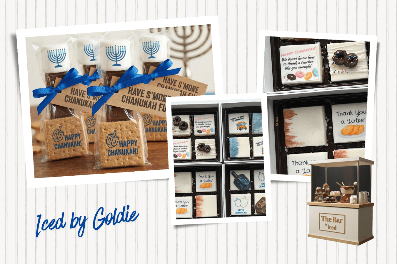 New for this season! In addition to our Chanukah events like cookie decorating and chocolate making, we are offering The Chocolate Bar… a custom cart with a chocolate crafting station of your choice– hot cocoa bombs, candy bombs or chocolate dipping. There are interactive activity items too—like a dreidel mug paired with a super-size hot cocoa bomb, “paint-your-own” cookie kits, and maze-like Chanukah cookies—all designed to delight both kids and adults. Under the supervision of the Vaad Hakashrus of Five Towns & Far Rockaway, our confections are Pareve and Yoshon. Whether you’re looking for a show-stopping dessert platter for a Chanukah party, a sweet hostess gift, or a fun family activity, Goldie’s Chanukah line feels festive, heartfelt, and perfectly tailored to celebrate Chanukah.