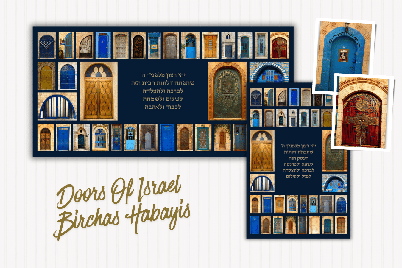Bring blessing and inspiration into your home or business with this beautiful and unique Birchas Habayis or Birchas Haesek artwork, featuring photos of doors from Jerusalem, Tzfat, and Chevron.