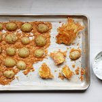 - Start by spreading a thin layer of shredded (not grated) Parmesan cheese on a parchment lined sheet pan. Set it aside.