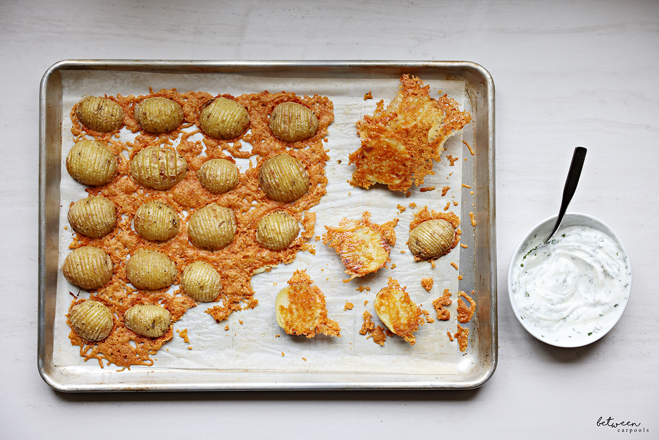 - Line up the potatoes on the Parmesan cheese. (It’s fine if they are closer together than in the photo here.) Bake at 425°F for 20-25 minutes. You want to make sure the potatoes are cooked through but the cheese isn’t overcooked.