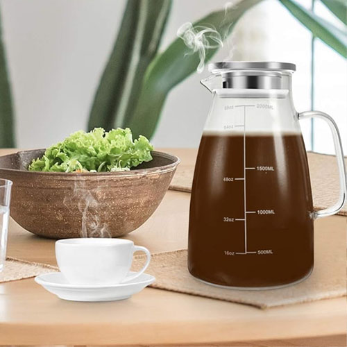 TAZO Passion Tea comes in two preparation types. There are regular tea bags – simply follow the instructions on the box and brew the tea directly in a heat-proof pitcher like this one. (Use 4 tea bags for 32 ounces of water.) Or buy the concentrate and skip the brewing process completely.