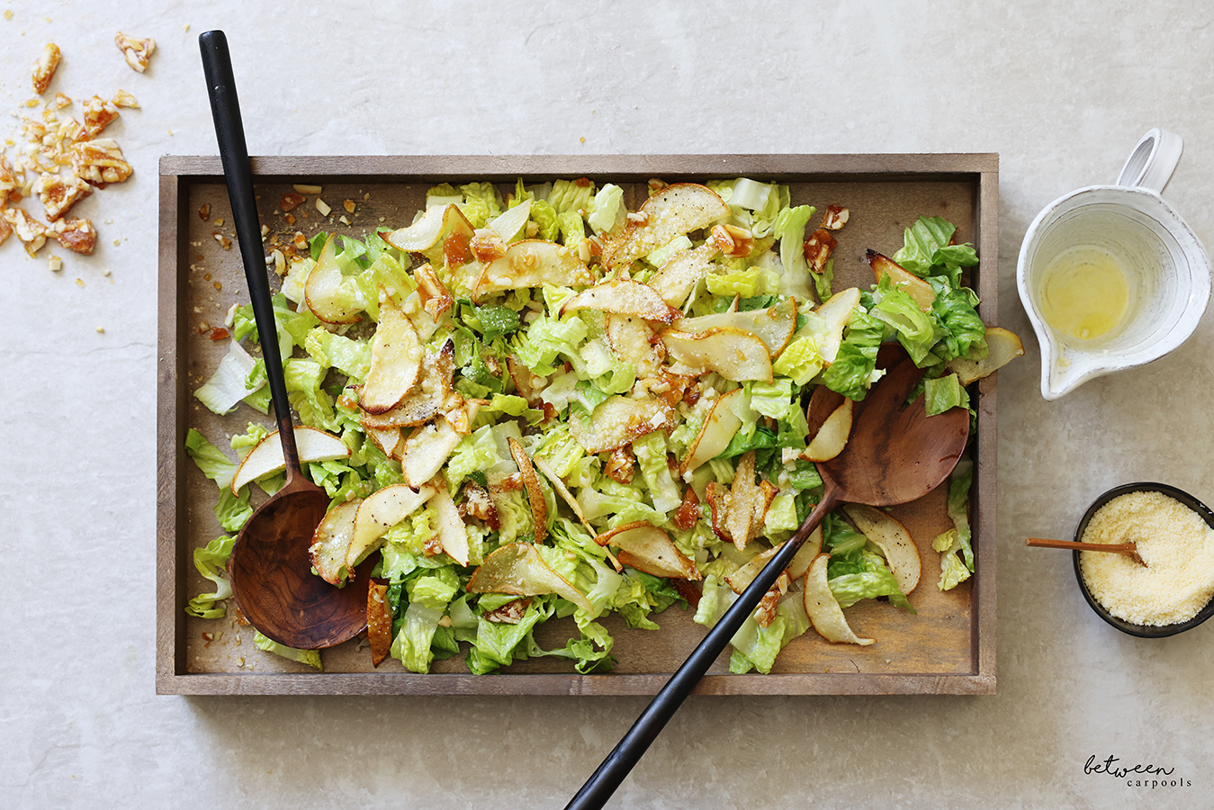 - Assemble the salad. Add Romaine to a platter or bowl. Top with pears, crushed bits of praline (save the rest of the praline for dessert, it will last indefinitely), and Parmesan. Dress before serving.