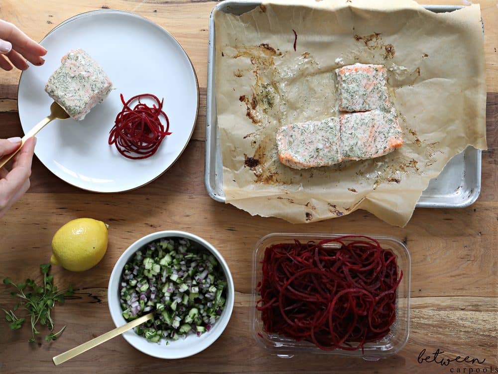 - To plate: Place a square of salmon on each plate. Cover entirely with the salad. Garnish with lemon slices and spiralized beets. Salmon can be served warm or cold.