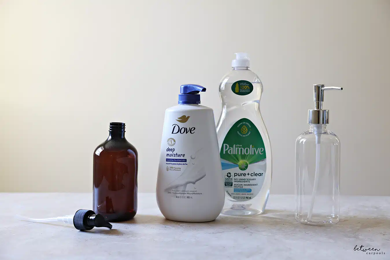 I have ones by Casabella called “sink sider duo or solo” for years ( on amazon) that are specifically designed for using while washing dishes and work and last amazing. Of course, for years I’ve been filling with clear soap 🙂 for the shampoo bottles, you can buy cute ones on Amazon that come in a set saying Shampoo, Conditioner and Body Wash (like they have in the hotels nowadays)
