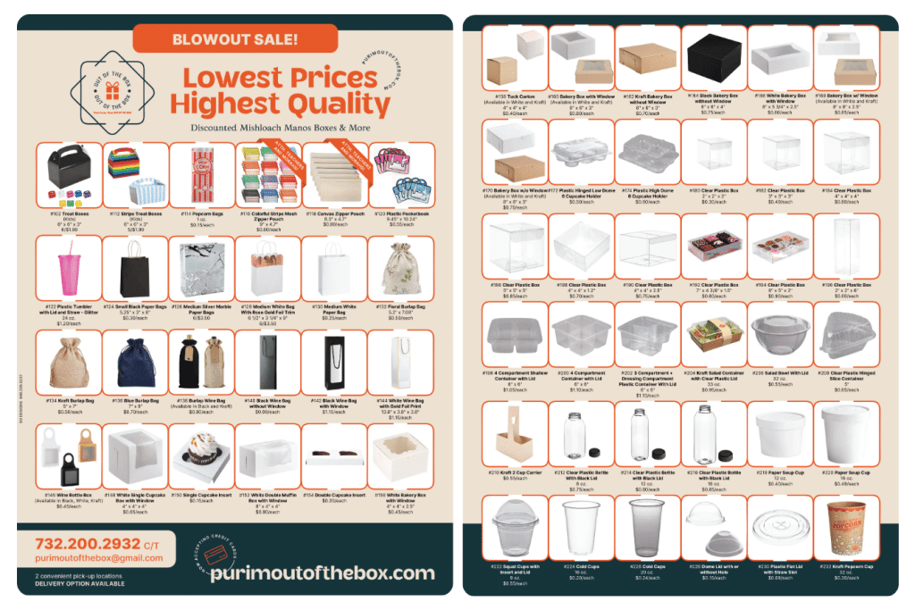 Just need packaging and want a discounted price? Out of the Box has a goal of delivering quality mishloach manos packaging at prices that won’t break the bank. They’re thrilled to offer an extensive selection of mishloach manos boxes at deeply discounted rates that can’t be beat. Whether you’re looking for elegant gift boxes, wine bottle bags, well-priced treat boxes, festive themed containers, or classic clear containers and bakery boxes, the wide variety of sizes and styles ensure you’ll find the perfect packaging to suit your needs and budget. For your convenience, they can ship and also offer two hassle-free pick-up locations and delivery options in Lakewood, NJ.