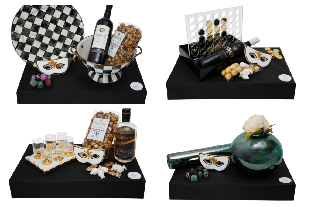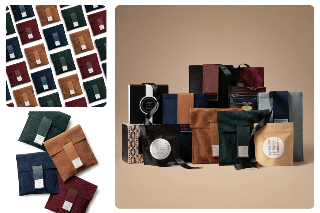 If you want mishloach manos that are ready-to-go like the felt and leather pouches and or the slider boxes, you can have something beautiful at a great price point ($12.50-$18). There’s also a beautiful line of really chic corporate mishloach manos options.