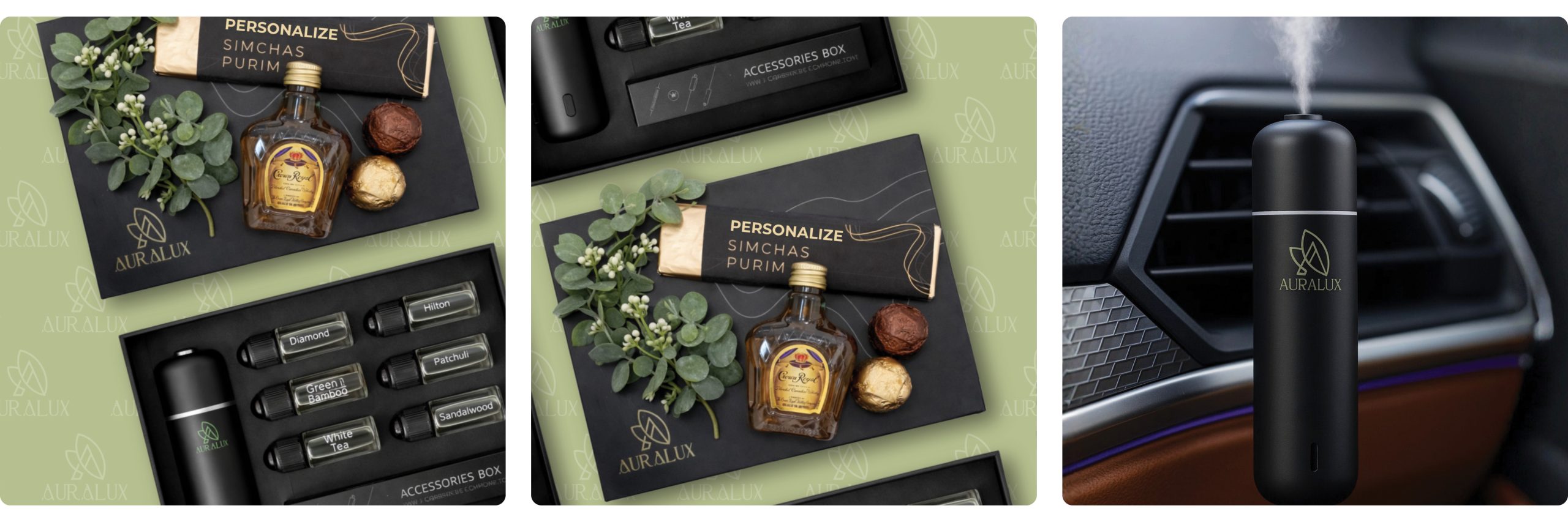 This Mishloach Manos gift set features a luxury car diffuser that delivers a curated fragrance experience. The set includes all 6 naturally fresh scent options. The diffuser is fully wireless, includes a USB-C charging cable, and automatically turns on and off when you start/stop your car. Multiple diffusion settings are available, releasing fragrance every 5 or 10 minutes.