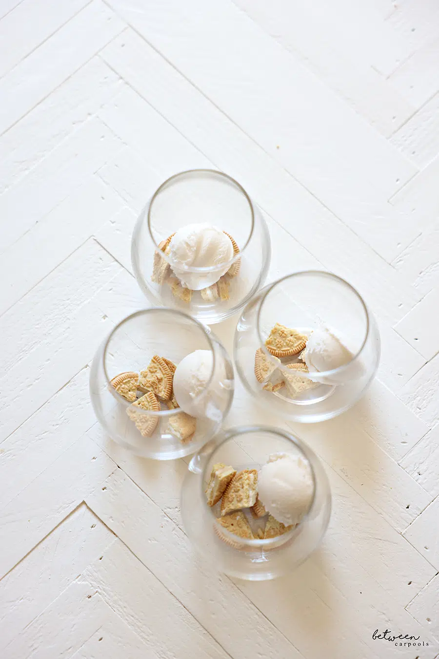 - 16 vanilla sandwich cookies, sliced into quarters.