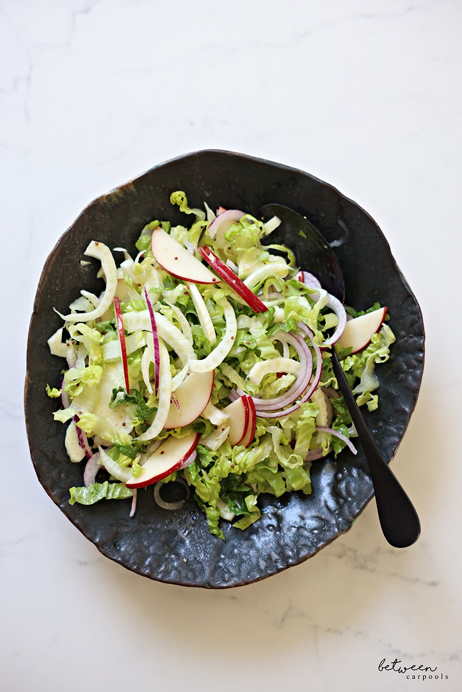 This refreshing Romaine, Apple, and Fennel Salad is both different and quick to prep. Plus–you can do it all quickly on Yom Tov.
