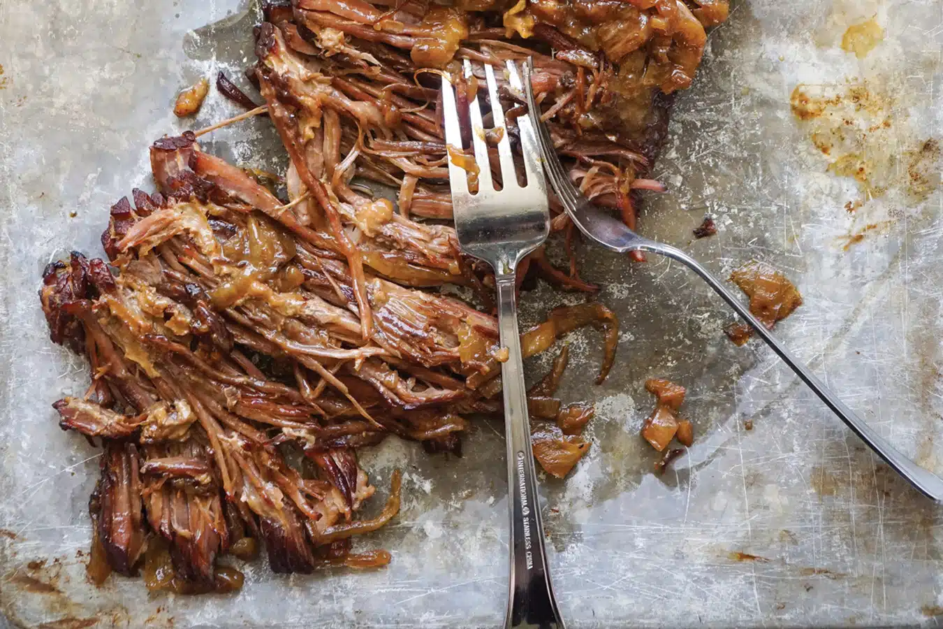 - Remove from oven. While the roast is still hot, pull the meat with two forks. Gently mix pulled meat with onions and pan juices.
