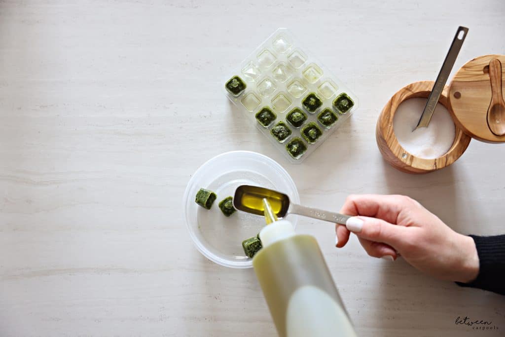 - Combine the frozen basil, olive oil, and salt. Store in a container until ready to use.